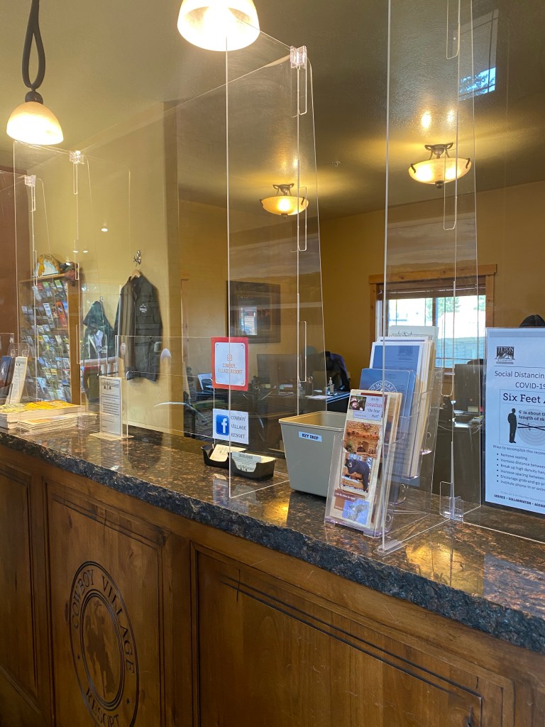 Checking into the Cowboy Village Resort was quick and easy. This was our first trip since COVID-19 and they made us feel safe. The front desk had plexiglass at the counter for extra protection in addition to sanitizer all over. When you first walk-in the lobby they have a box of masks for you to grab one if you forgot.