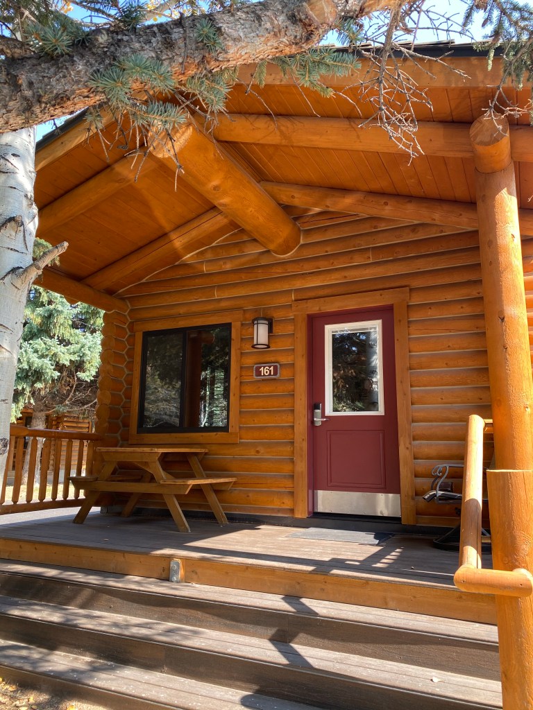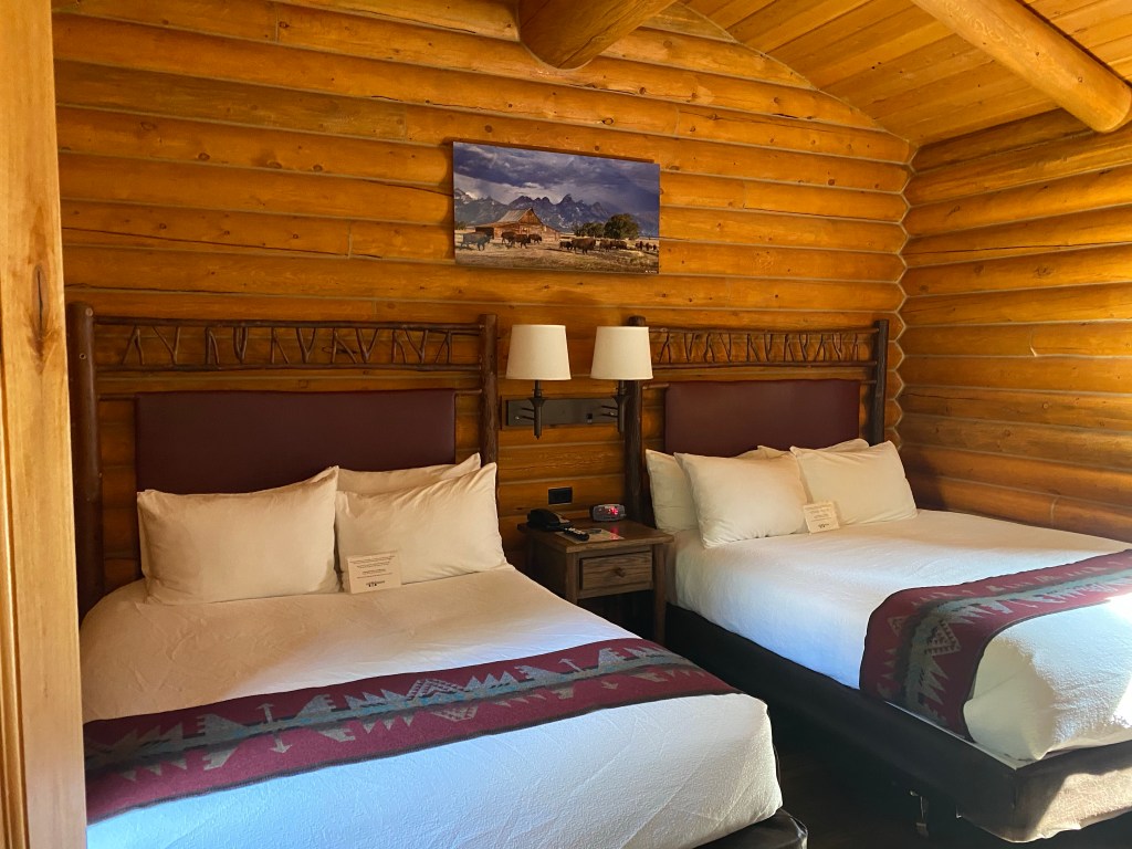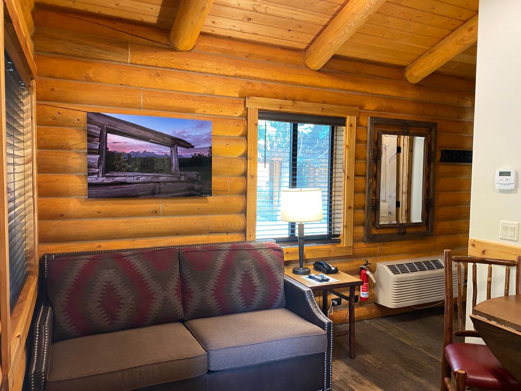 We stayed in the Deluxe Grand Teton Suite that slept 6 people. When you first walk-in they have a full kitchen and a very comfortable sleeper sofa. The bathroom is very spacious and has a nice LED mirror, which provided prime lighting for our makeup. The bedroom has 2 queen beds, in addition to a large dresser and wardrobe! It was so neat to see the cabin decorated with art from local artists. We utilized the picnic table on our porch for a cup of coffee before we hit the road for our daily adventures. Overall we had a wonderful time and definitely will be staying at the Cowboy Resort again!