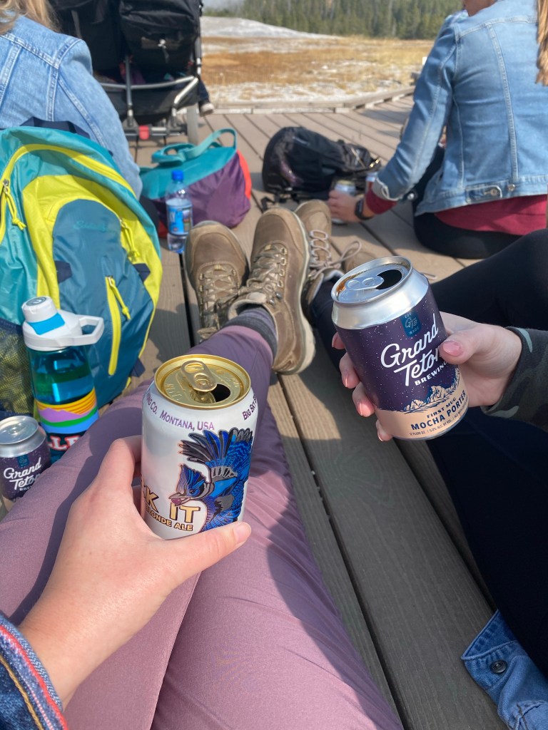 We purchased a few different types of beer to enjoy while we are waiting. We had a variety from Huckleberry to Stouts. LISTEN UP, the beer was only $2. Yes you heard that correct and it is local Yellowstone and Teton beer! The viewing area for Old Faithful has plenty of seating options. We sat down on the board walk and set up our little picnic.
