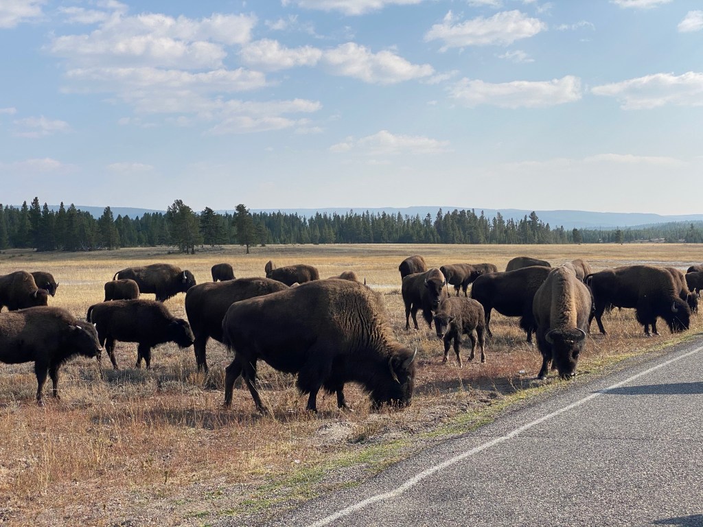 Our next stop was Grand Prismatic Spring. The spring was about 20 minutes from Old Faithful. This was the hottest spring in the park and super colorful. We would recommend going to the second lot for parking. That lot provides closer views that are more impressive, but don’t get too close. From here we drove about 25 minutes to view the Bison. When we arrived they were crossing the road right in front of our car! STAY IN THE CAR!!They are very unpredictable and will charge you.