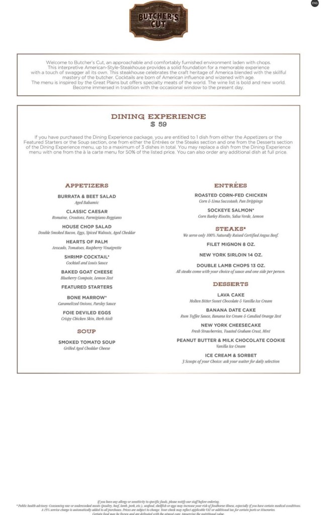 MSC perks of being diamond: welcome bottle of champagne and dessert, private party with drinks, welcome gift, priority boarding and disembarkation, a free picture taken in the dining room. You also receive a free meal at one of the specialty restaurants including a plus one. We chose the Steakhouse for our dining experience, later in the blog we will share our experience and menu.