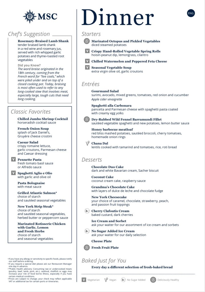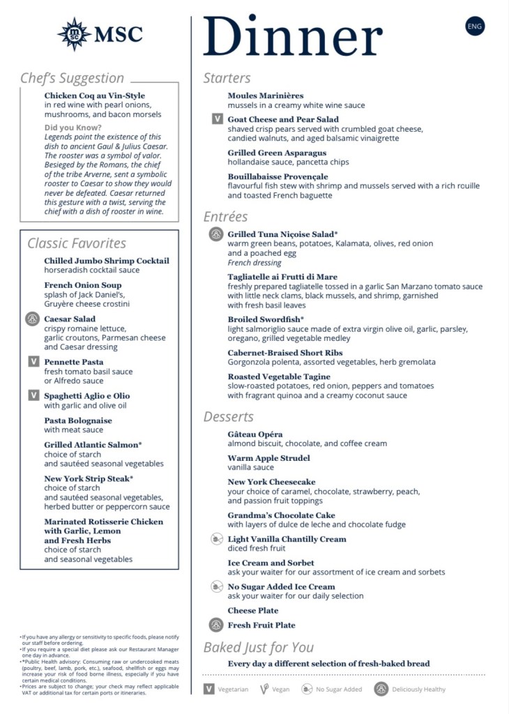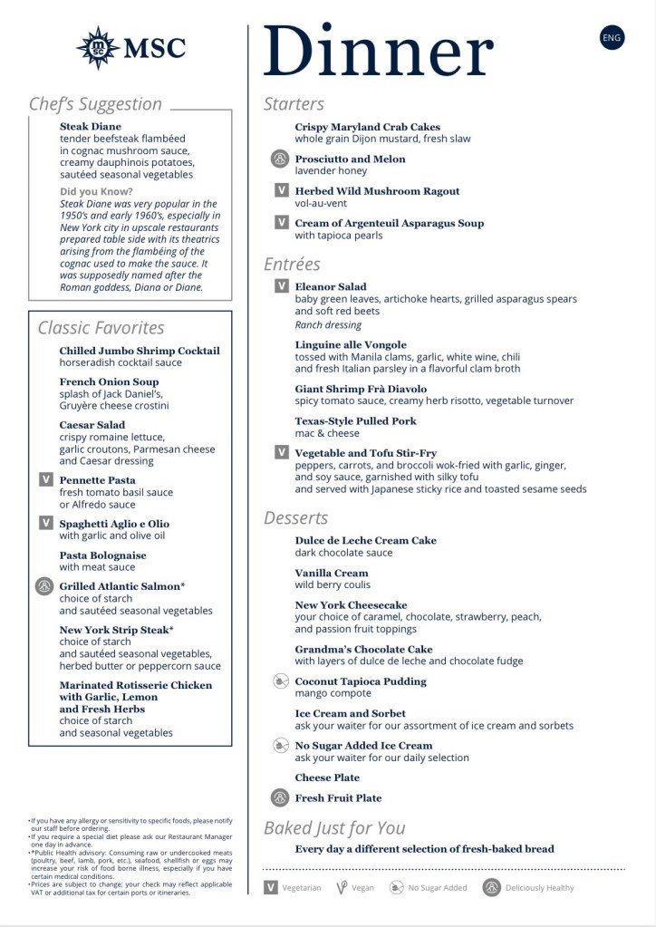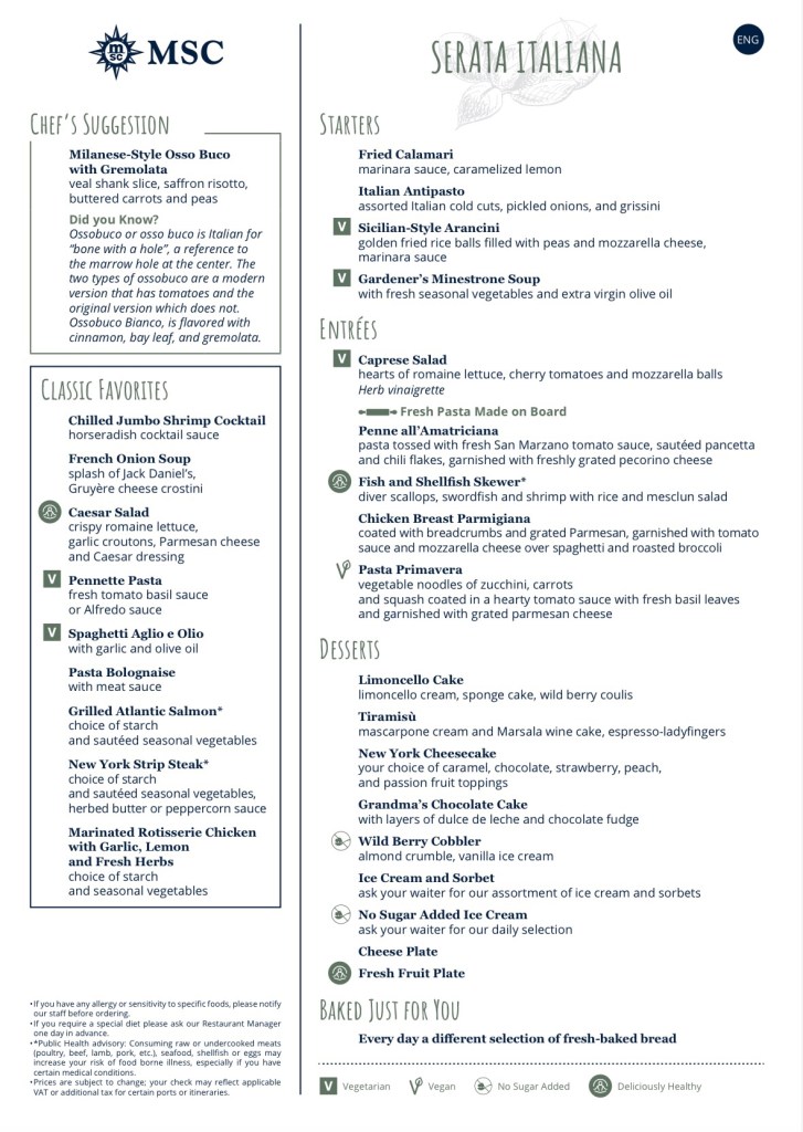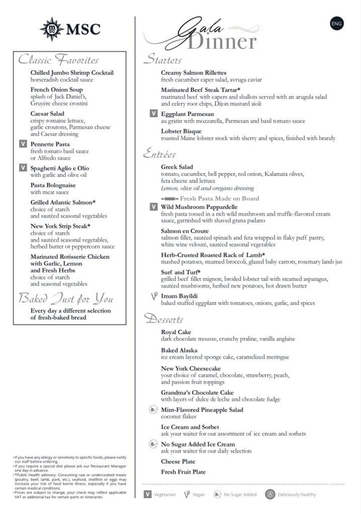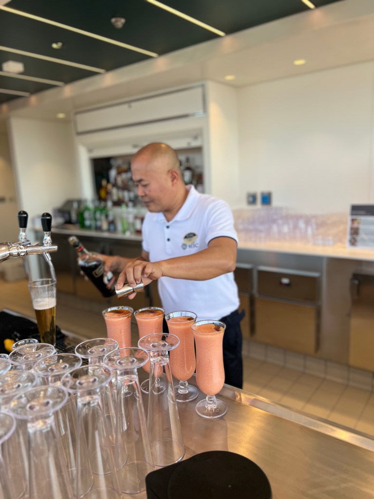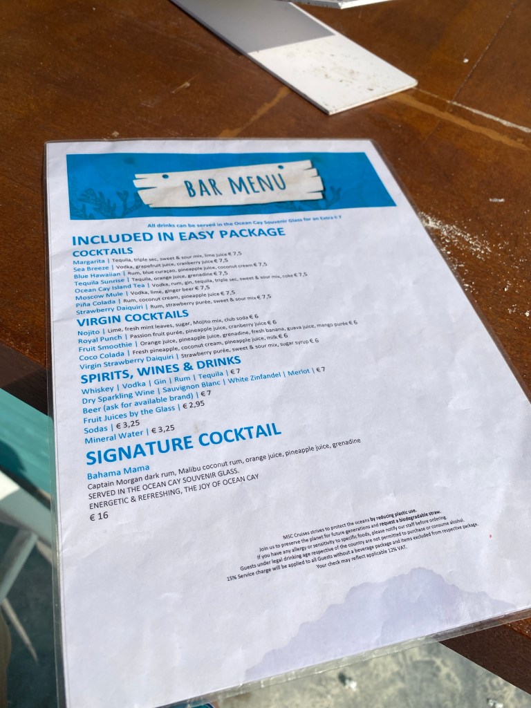 Drinks: When booking we added the drink package and WIFI to our booking. This is an absolute must! We had the easy plus package which includes drinks for $9. We did not have any issues finding drinks that were not included. Something different on MSC they do not serve glasses of water in the dining room or at the bar. You have to request a glas of water.  They have still or sparkling water included in the drink package. Since MSC is primarily in Europe and the servers are used to serving many cultures. Something that comes from that is they never bring ice, but don’t be shy to ask for it.