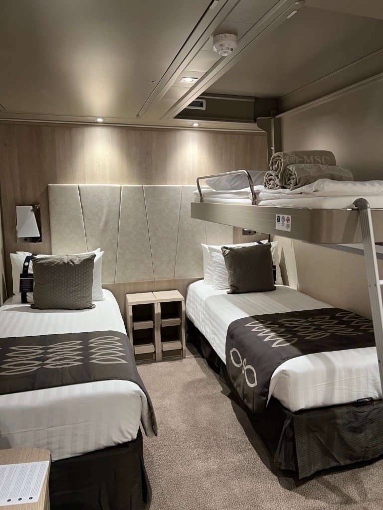 We booked the interior cabin for 3 people. The bedding consisted of 2 lower beds and 1 bunk bed. There was a huge full length mirror on the wall which was amazing for getting ready. There was plenty of bright lighting and closet storage. The bathroom was nice and had a glass shower door! For those of you that have cruised on some of the older ships you will know what a luxury it is to not have the shower curtain stick to you. If you have mobility issues I suggest reserving a larger cabin, because while the shower doors were nice to have they are very small! The room had plenty of outlets plus USB outlets.